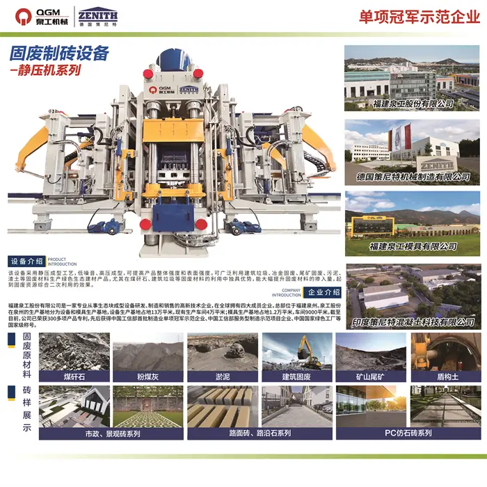 Společnost Fujian Quangong Co., Ltd., jako měřítko v průmyslu strojů na tváření betonových bloků, vždy dodržovala inovativní výzkum a vývoj a vytvořila vlastní základní technologii založenou na integraci pokročilé německé technologie. Díky vynikající výkonnosti produktů, vysoce konkurenčním cenám a komplexnímu systému předprodeje, prodeje a poprodejního servisu byly produkty exportovány do více než 140 zemí a regionů a získaly na trhu širokou chválu. Současně společnost Quangong Machinery Co., Ltd aktivně reagovala na národní výzvu a vedla a organizovala účast na formulování více národních norem, průmyslových norem a skupinových norem, zavázala se podporovat vývoj čínských strojů a zařízení směrem k vysoce kvalitní inteligenci.