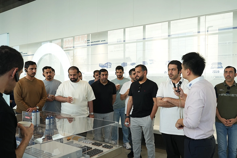 V řídicím středisku platformy inteligentních zařízení pro cloudové služby delegace sledovala scénář inteligentního provozu a údržby, který demonstroval, jak lze zařízení monitorovat na dálku. Tato platforma jako hlavní inovace Quanzhou Machinery integruje špičkové technologie, jako je cloud computing, velká data a umělá inteligence. Dokáže shromažďovat provozní data v reálném čase z více než 1 000 jednotek inteligentních zařízení po celém světě, což umožňuje plné funkce správy životního cyklu včetně online monitorování, vzdálených upgradů, predikce a diagnostiky poruch a hodnocení stavu zařízení. Členové delegace se ptali na případy aplikací platformy a rychlost odezvy služeb na Středním východě a vysoce chválili její efektivní a nízkonákladová řešení provozu a údržby pro zahraniční zákazníky. Věřili, že tato technologie dokonale splňuje požadavky sektoru infrastruktury SAE na inteligentní a efektivní zařízení.